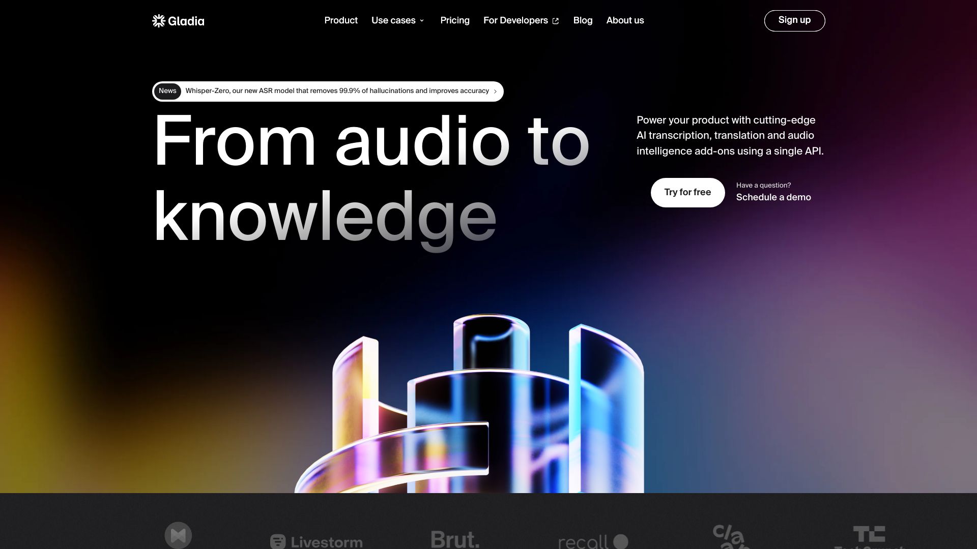 - Gladia I Spracherkennungs-API kann in virtuellen Meetings, Zusammenarbeit im Arbeitsbereich, Inhalt & Medien und Callcentern eingesetzt werden, um die Produktivität zu verbessern und das Benutzererlebnis zu optimieren.