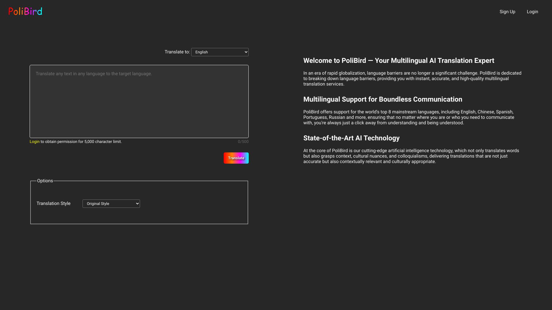 - Ja, PoliBird bietet verschiedene Übersetzungsstile an, darunter formaler oder akademischer Stil, geschäftlicher oder professioneller Stil, konversationeller oder informeller Stil sowie literarischer oder kreativer Stil.