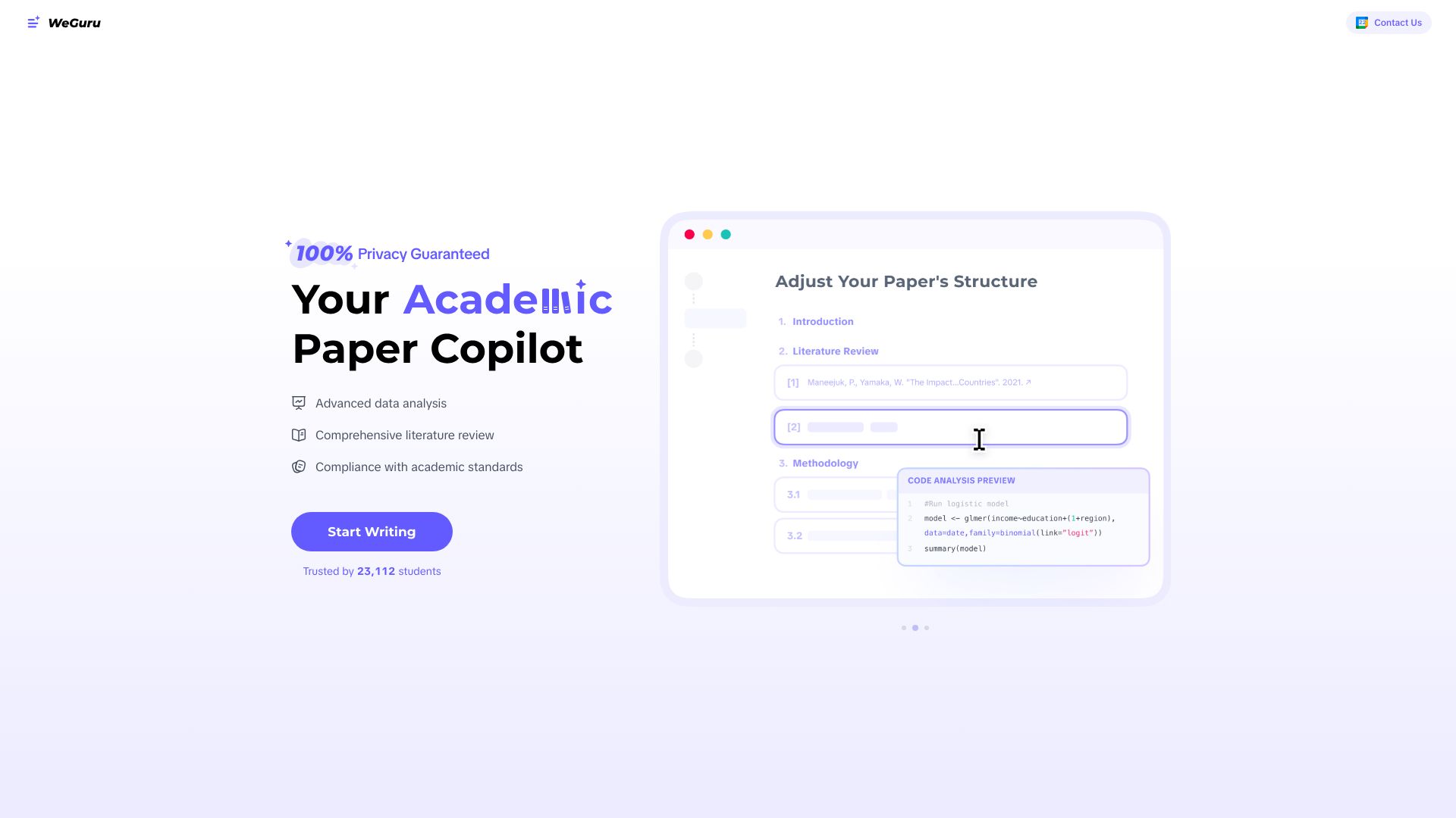 - WeGuru ist ein KI-gesteuertes Tool, das umfassende akademische Entwurfsunterstützung bietet. Es zeichnet sich durch qualitative und quantitative Analyse aus und bietet Benutzern gut strukturierte Entwürfe, die alle Abschnitte ihrer Papiere abdecken.