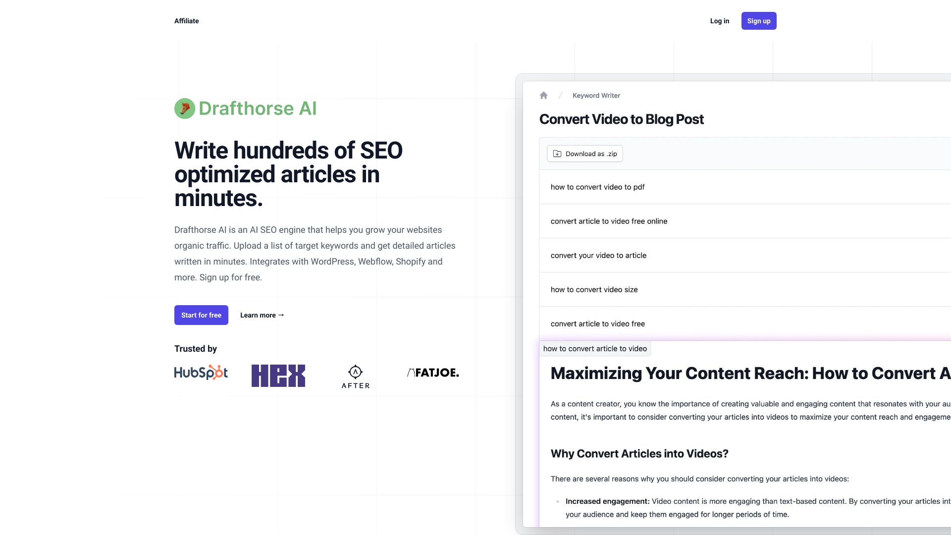 - Drafthorse AI vous permet de télécharger une liste de mots-clés cibles, et il génère des articles détaillés basés sur ces mots-clés. Il s'intègre avec des plateformes de site web populaires comme WordPress, Webflow, Shopify et bien d'autres.