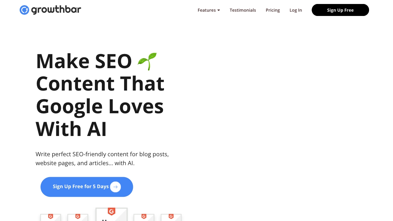 - GrowthBar a reçu 5 étoiles sur Capterra et 4,9 étoiles sur G2 en raison de ses capacités supérieures de génération de contenu IA. De plus, GrowthBar propose la recherche de mots-clés, le suivi du classement et la recherche de backlinks, ce qui en fait un outil complet pour augmenter le trafic web.