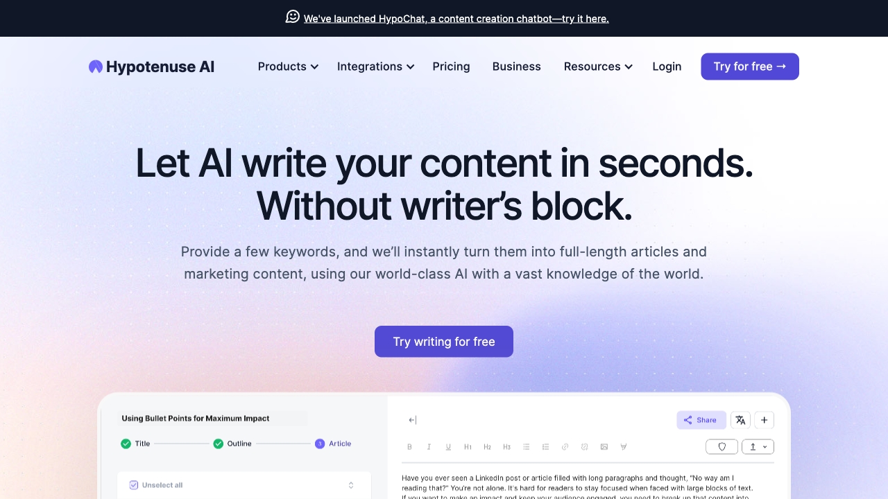 - Le prix d'un assistant d'écriture IA varie en fonction du fournisseur. Hypotenuse IA propose des tarifs à partir de 29 $/mois avec une période d'essai gratuite de 7 jours et aucune carte de crédit requise.