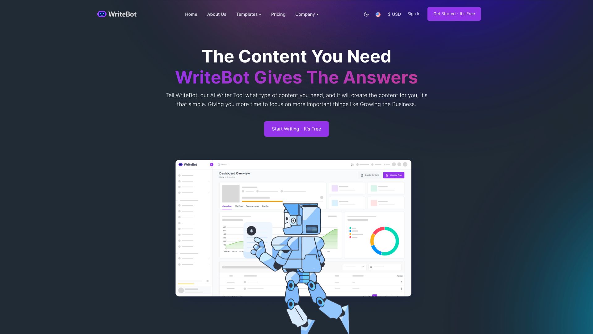 - WriteBot AI peut générer différents types de contenu tels que des articles de blog, des modèles d'e-mails, des publications sur les réseaux sociaux, des contenus de site web, et bien plus encore. Il propose des modèles personnalisés et permet aux utilisateurs de créer du contenu personnalisé correspondant à leurs besoins spécifiques.