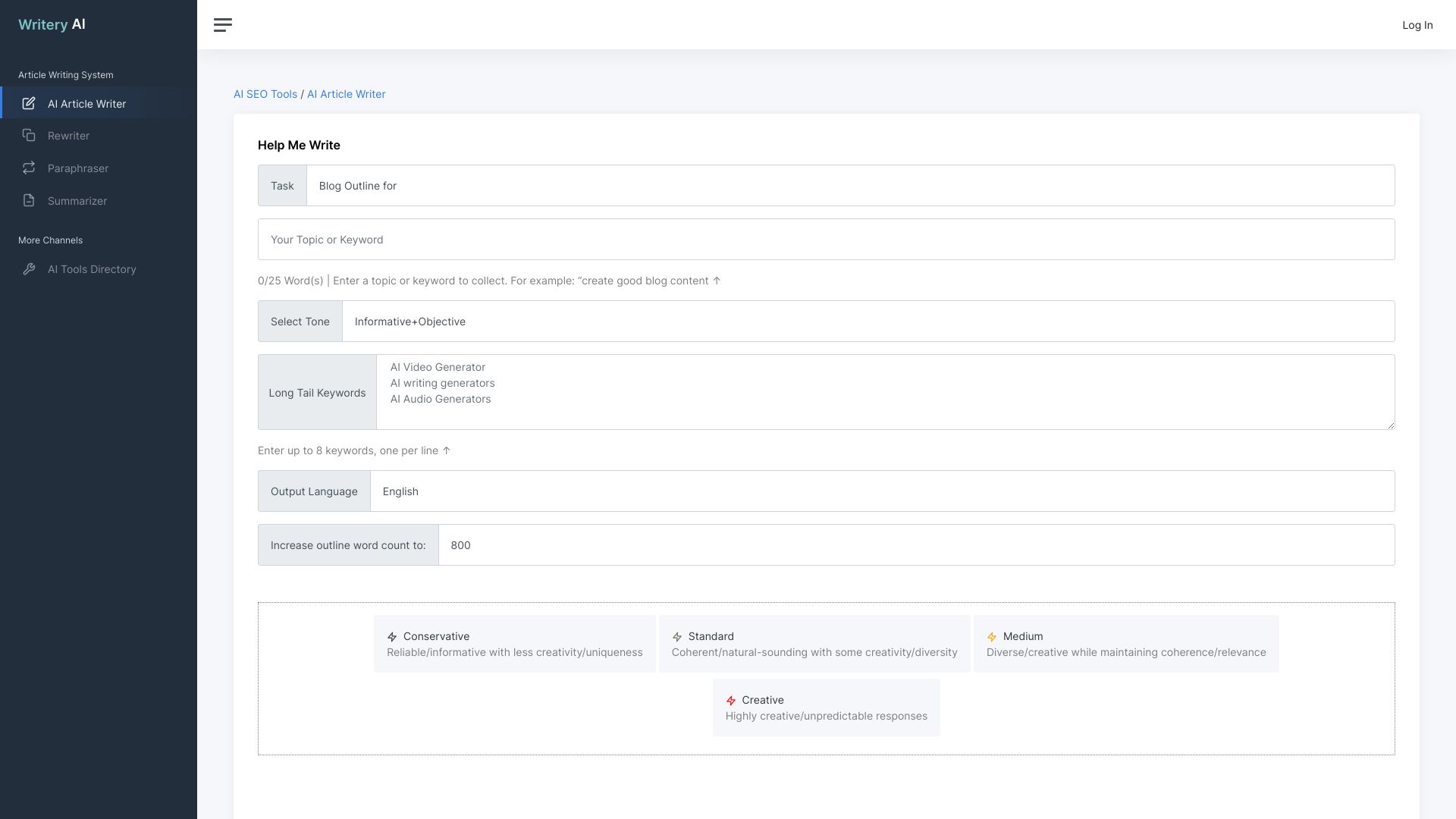 - Le générateur de texte AI propose quatre niveaux d'écriture : Conservateur, Standard, Moyen et Créatif. Le niveau que vous choisissez détermine le degré de créativité et d'unicité du texte généré.