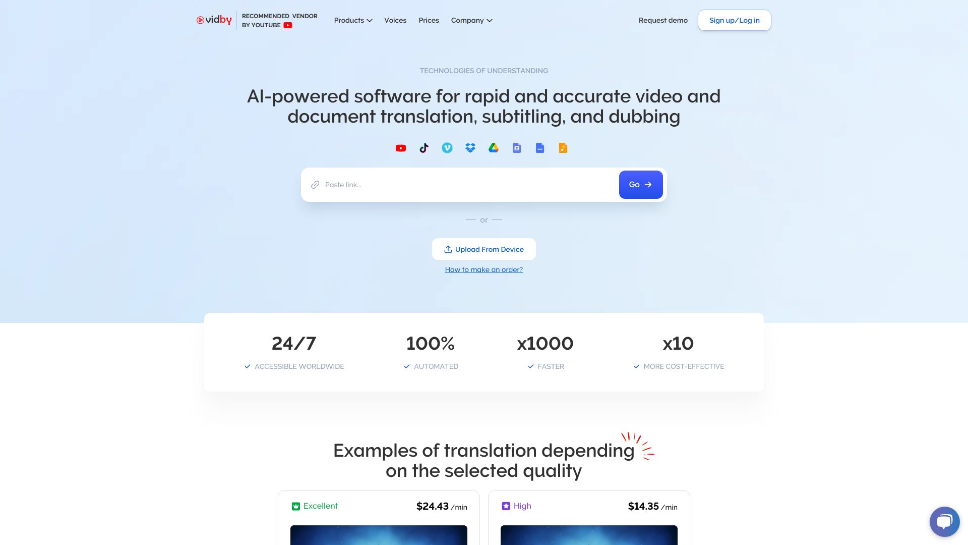 Vidbyは、AIパワードのソフトウェアを使用して、迅速で正確なビデオの翻訳、字幕付け、吹き替えを提供します。50以上の言語をサポートし、ビデオの特定の要件に応じて品質レベルを選択できます。