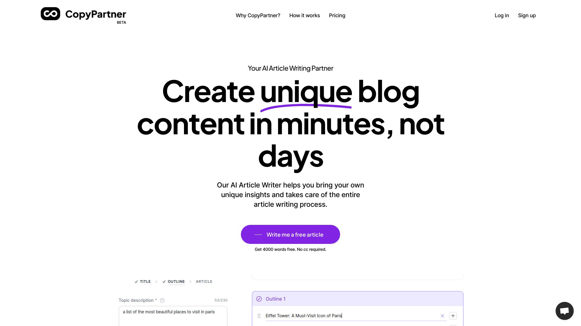 - CopyPartner에 의해 생성된 기사는 아웃라인 길이에 따라 약 1500-6000단어입니다.