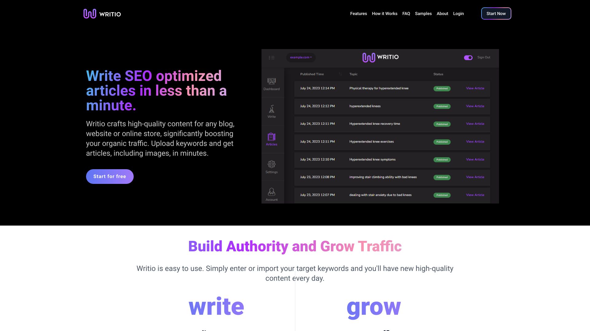 - Sim, o Writio ajuda com SEO ao criar artigos otimizados para SEO que são indexados e têm uma classificação alta nos motores de busca. Ele pode aumentar significativamente o tráfego orgânico tanto para sites mais novos quanto para sites estabelecidos.