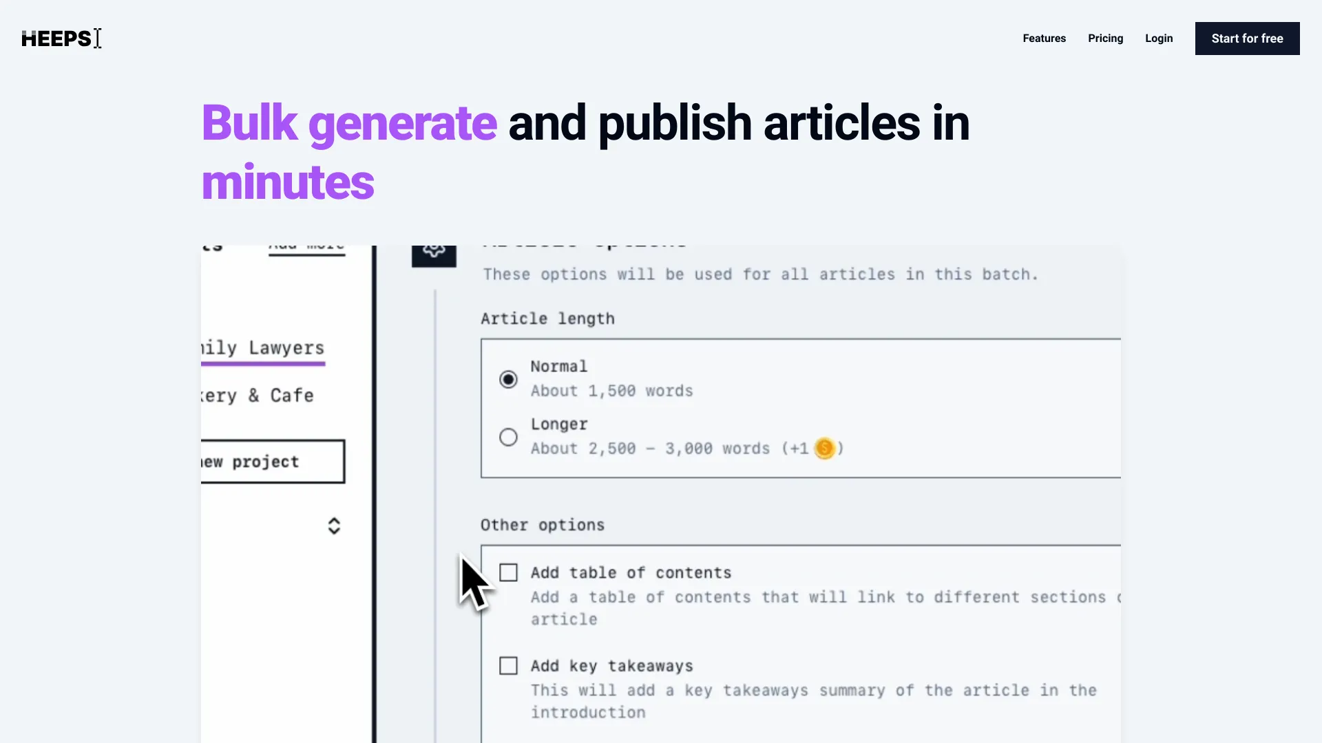 - Heeps是一个用于批量生成和发布文章的AI平台。只需复制粘贴或上传一份文章标题列表,Heeps将完成其余的工作。